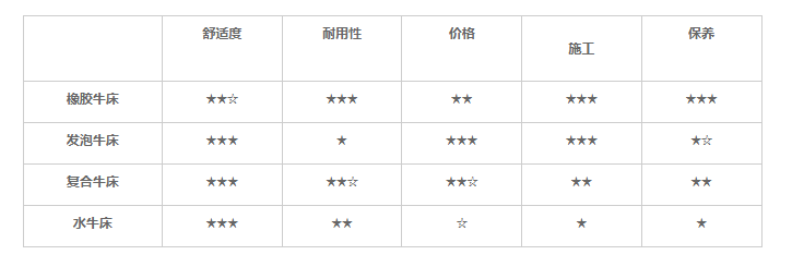 フォームマットレスは軽く、敷きや交換も簡単です。クッション性を良いけど、損傷しやすい、しばらく使用すると崩れや変形になります・ベッドに糞や尿が滞留する現象もよくあり、ベッドの温度が高すぎる現像もあります。牛体とベットの間に空気の流れを増やすために、ゴム製よりも多くの敷床材を必要とします。 時々に変形や膨張した部分のマットレスをトリミングする必要があり、農場に多くの人件費がかかります。現在、この材質は主に外国の先進国で使用されており、国内の牧場ではほとんど採用されていません。